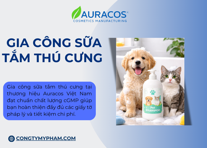 Gia công sữa tắm thú cưng tại Auracos Việt Nam là giải pháp được nhiều doanh nghiệp tin tưởng và lựa chọn để xây dựng thương hiệu riêng trong lĩnh vực chăm sóc thú cưng. Với giải pháp này, doanh nghiệp có thể rút ngắn thời gian ra mắt sản phẩm, hãy liên hệ ngay congtymypham.com để tìm hiểu chi tiết về dịch vụ gia công sữa tắm thú cưng nhé!